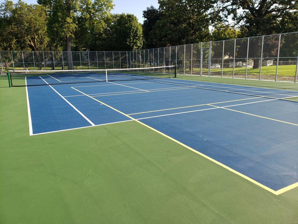 At the Park Elementary School, the existing bituminous courts were removed because of poor existing pavement conditions and the subgrade was prepared for the post-tensioned surface. The post-tensioned surface was constructed in a single pour with initial tendon tensioning occurring within hours of concrete placement. Perimeter fence posts for the tennis court were placed in a maintenance strip outside of the post-tension slab to allow for ease of construction and for maintenance purposes. Interior fence posts separating the north courts from the south courts were placed in the post-tensioned slab with design consideration given for slab movement due to tensioning. An integral maintenance strip/retaining wall was designed along the south edge of the courts to allow for grade change between the existing pavement and the proposed courts and two Pro Dunk Diamond Basketball hoop systems were constructed south of the courts. The courts were finished with blue courts and a green background and were striped for pickleball at the request of the Owner. Additionally, the total impervious area of the Park Elementary project site was decreased in order to meet stormwater requirements for the City of Hutchinson.