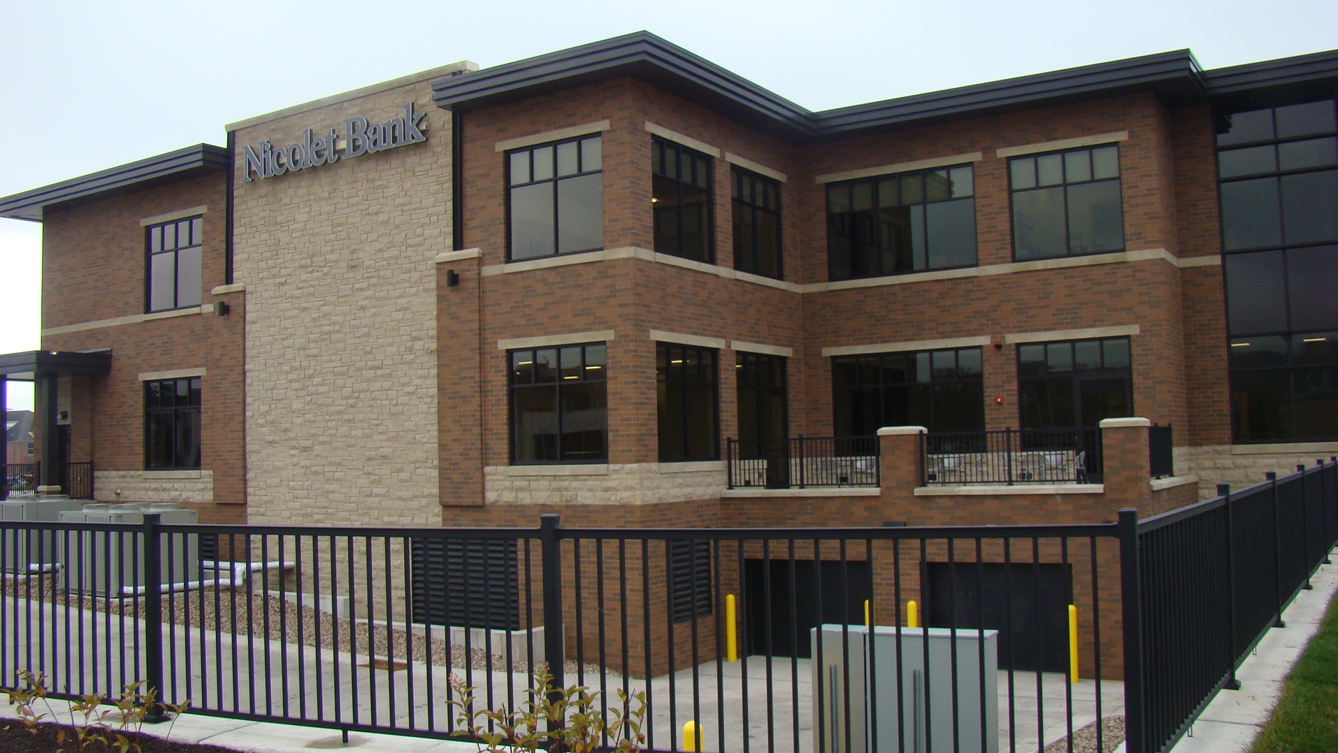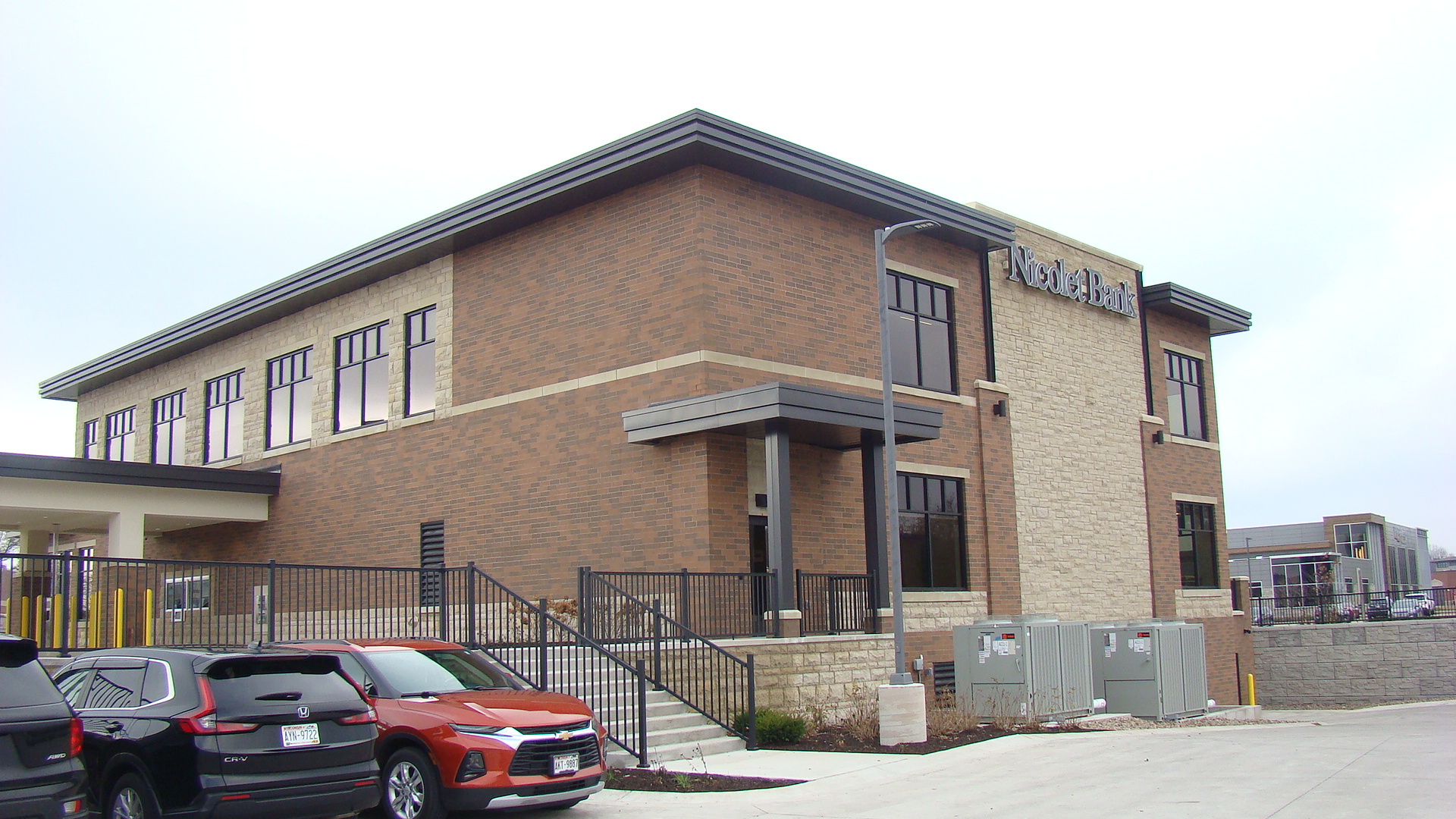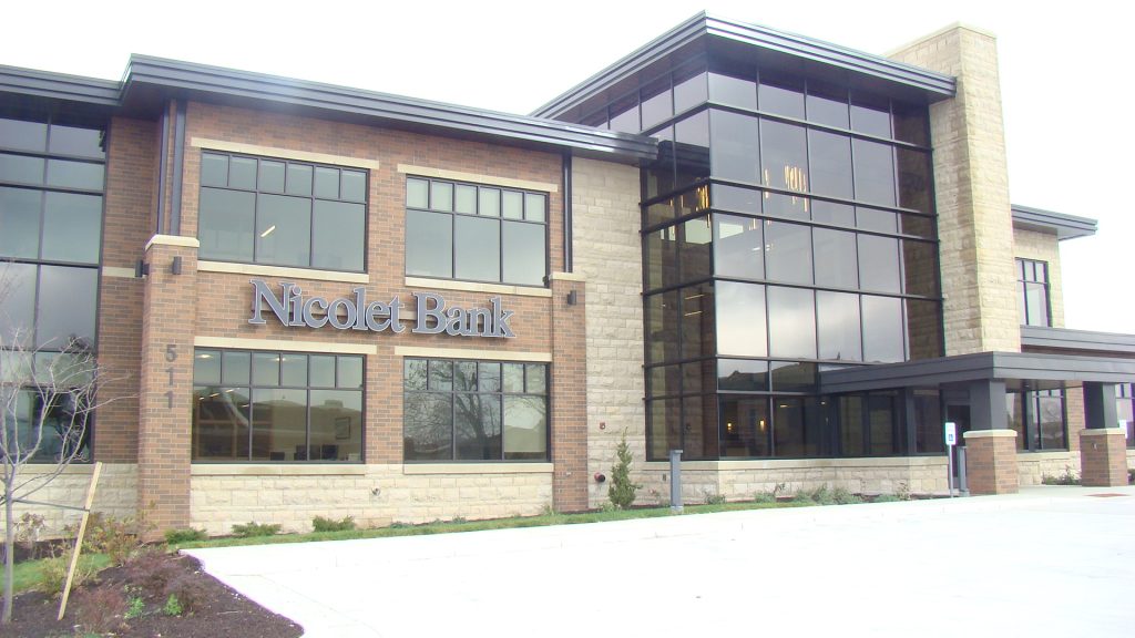 This new Nicolete Bank branch in Wausau, Wisconsin is a 19,000 square foot building located along Wausau’s primary corridor. The exterior boasts a two-story glass window with stone masonry and exposed steel beams.